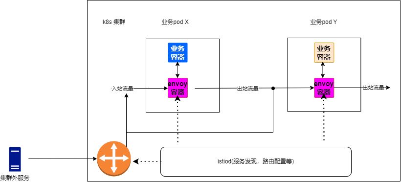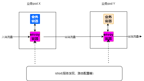 它借助 k8s 中“边车模型”,在一个 pod 中放置两个容器:一个专门做流量管控的容器(里面部署 envoy 服务),一个做业务逻辑处理的容器。入站流量先进入 envoy 容器,然后再转发到业务容器中。这种结构虽然规避了中心化这个弱点,但是也只能在 k8s 集群内部使用。在 k8s 集群外部,依然要经过 isito gateway 来转发流量: