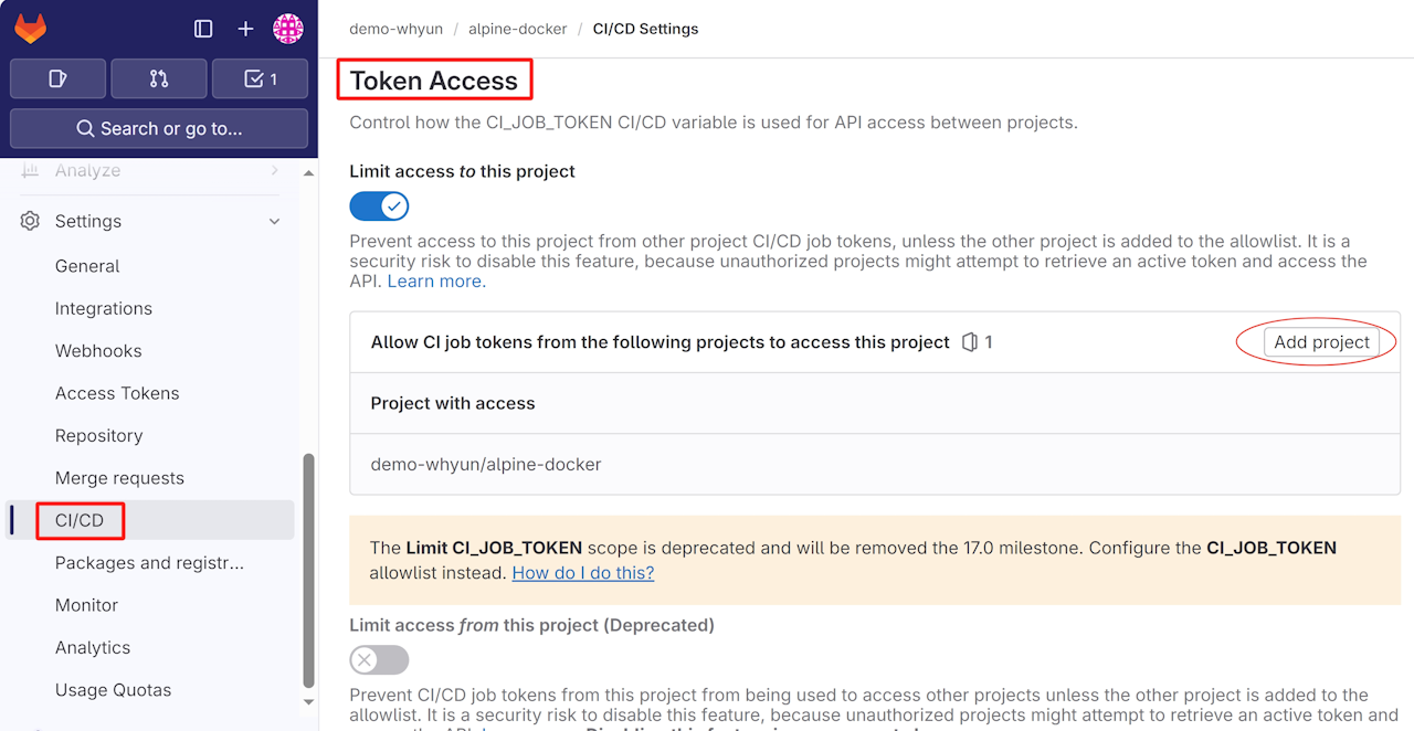 CI_JOB_TOKEN进行了限制,默认需要在 Settings -> CI/CD -> Token Access 中手动添加项目白名单才能允许跨项目访问。如果嫌麻烦,可以直接将 Limit access to this project 关闭掉。