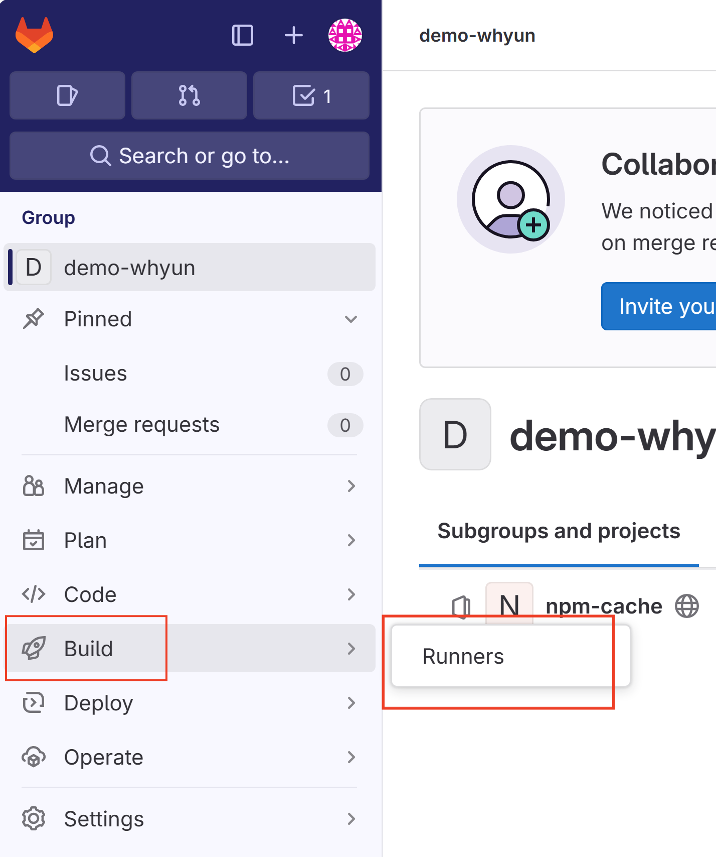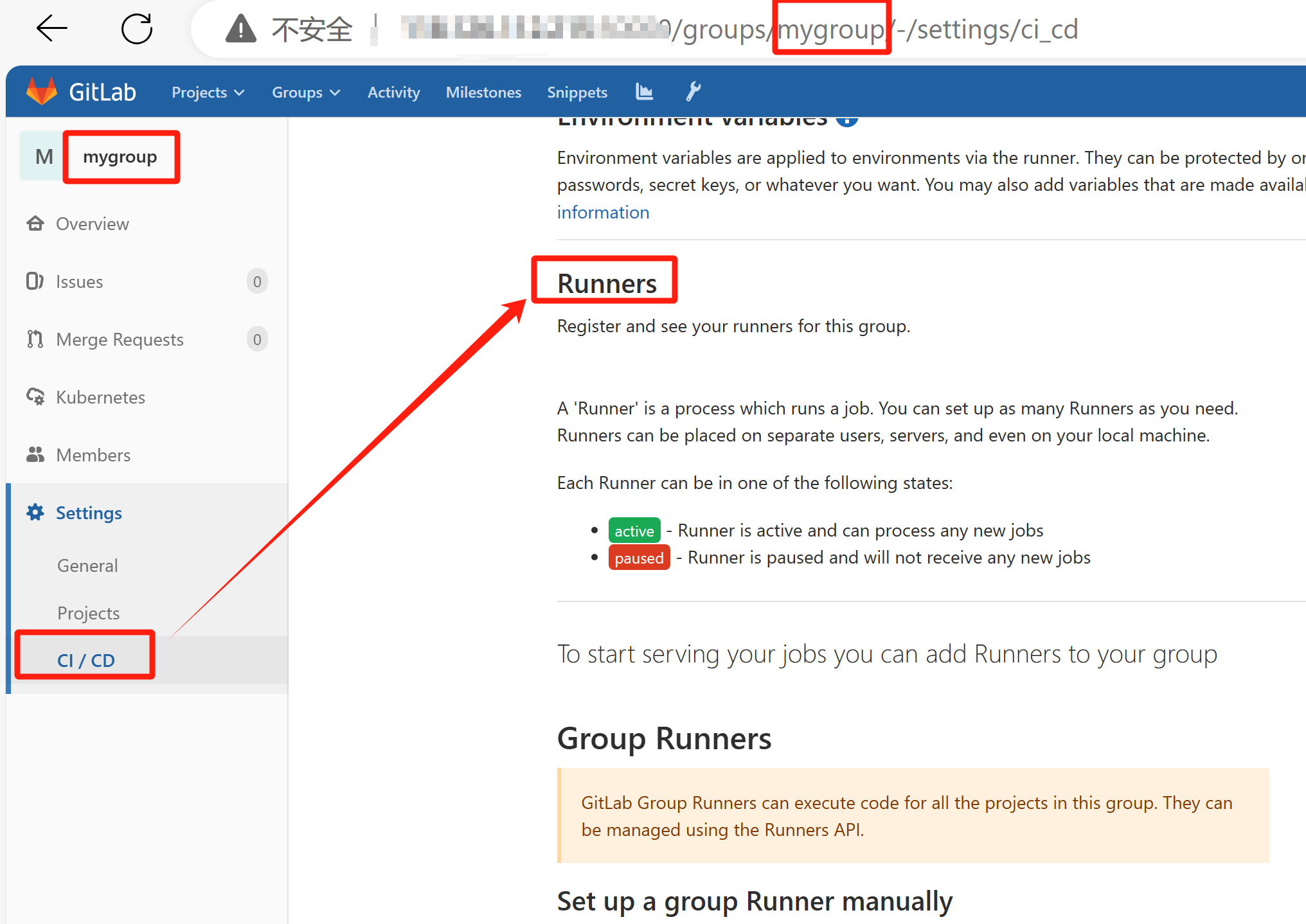 新版的 gitlab 不仅仅带来新的 runner 注册方式,同时还修改了若干 runner 配置的代码位置。对于组级别的 runner 来说,放到了组下的 Build -> Runners 菜单下面: