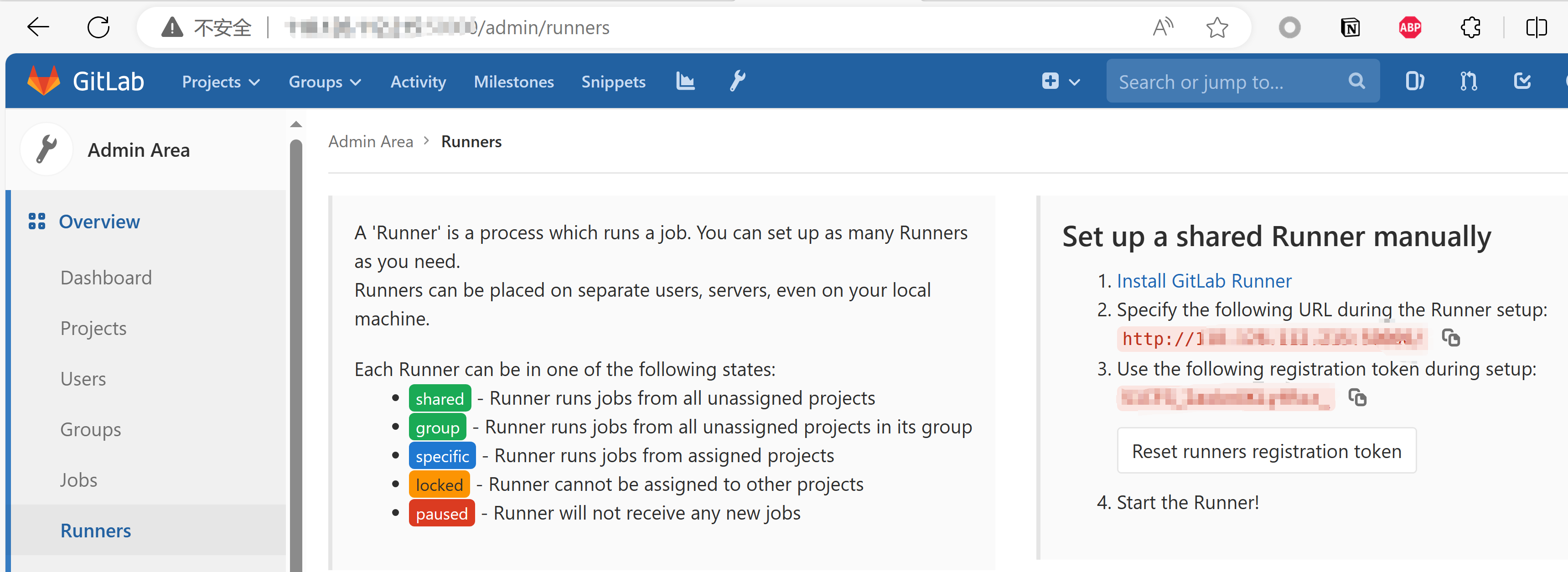 全局 runner,在 gitlab 中称之为 shared runner,可以通过访问 /admin/runners 路径访问到,不过你需要有超级管理员权限,否则访问路径会显示 404。
