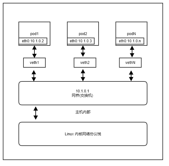 pod 和主机之间 通过 veth pair 技术 进行通信,veth pair 类似于管道,一端发送的数据,可以在另一端收到。如果是统一主机上的 pod 们相互通信,就可以借助于网桥。网桥工作在链路层,可以将其理解为现实中的交换机,veth 网卡和网桥之间的连接,可以理解为网络终端通过网线和交换机之间的连接。网桥内部存储每个网口对应的 MAC 地址映射表,数据链路层的数据包到达网桥后,通过查询映射表就可以准发到对应接口了。