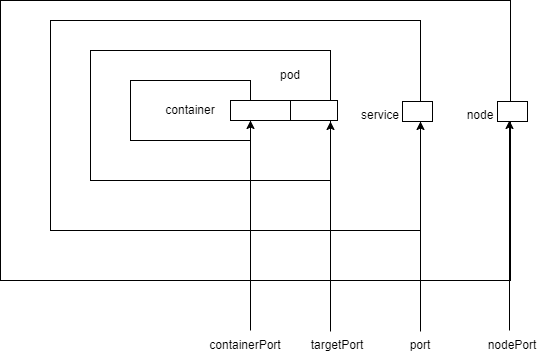 k8s 中除了 port 的概念,还有 nodePort targetPort containerPort 的概念,其内部关系如下: