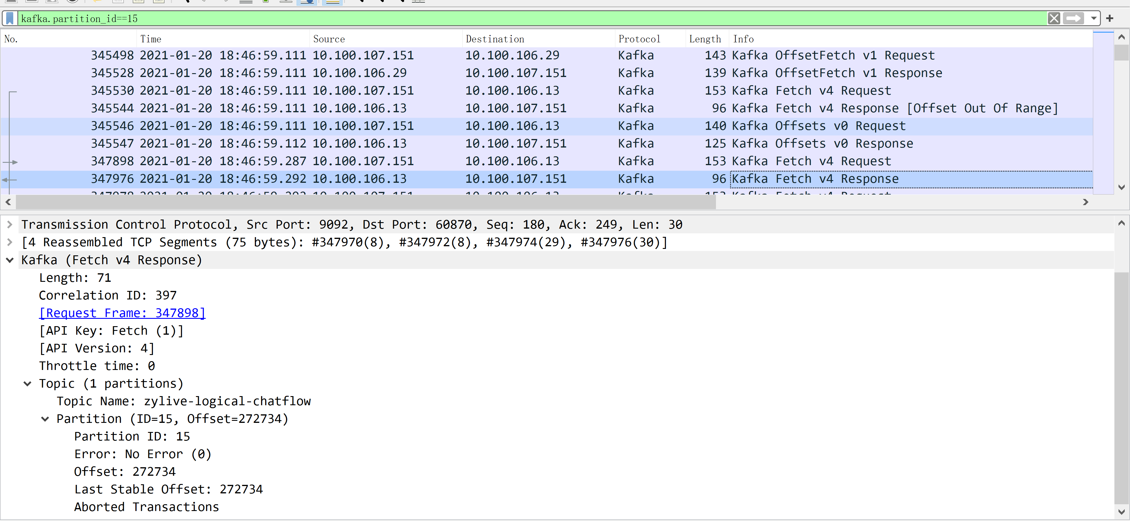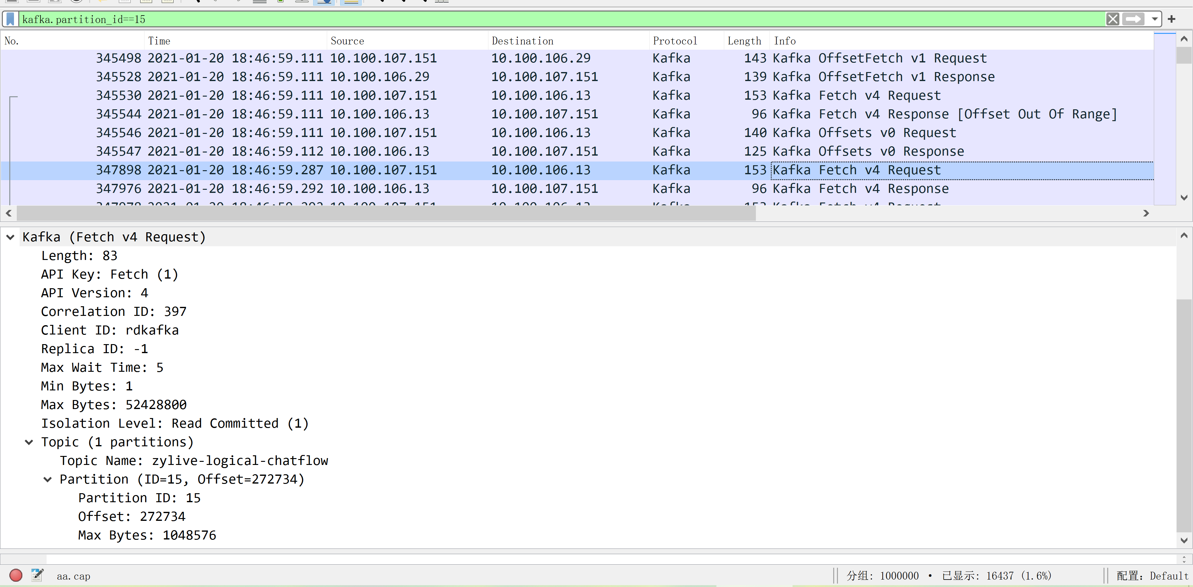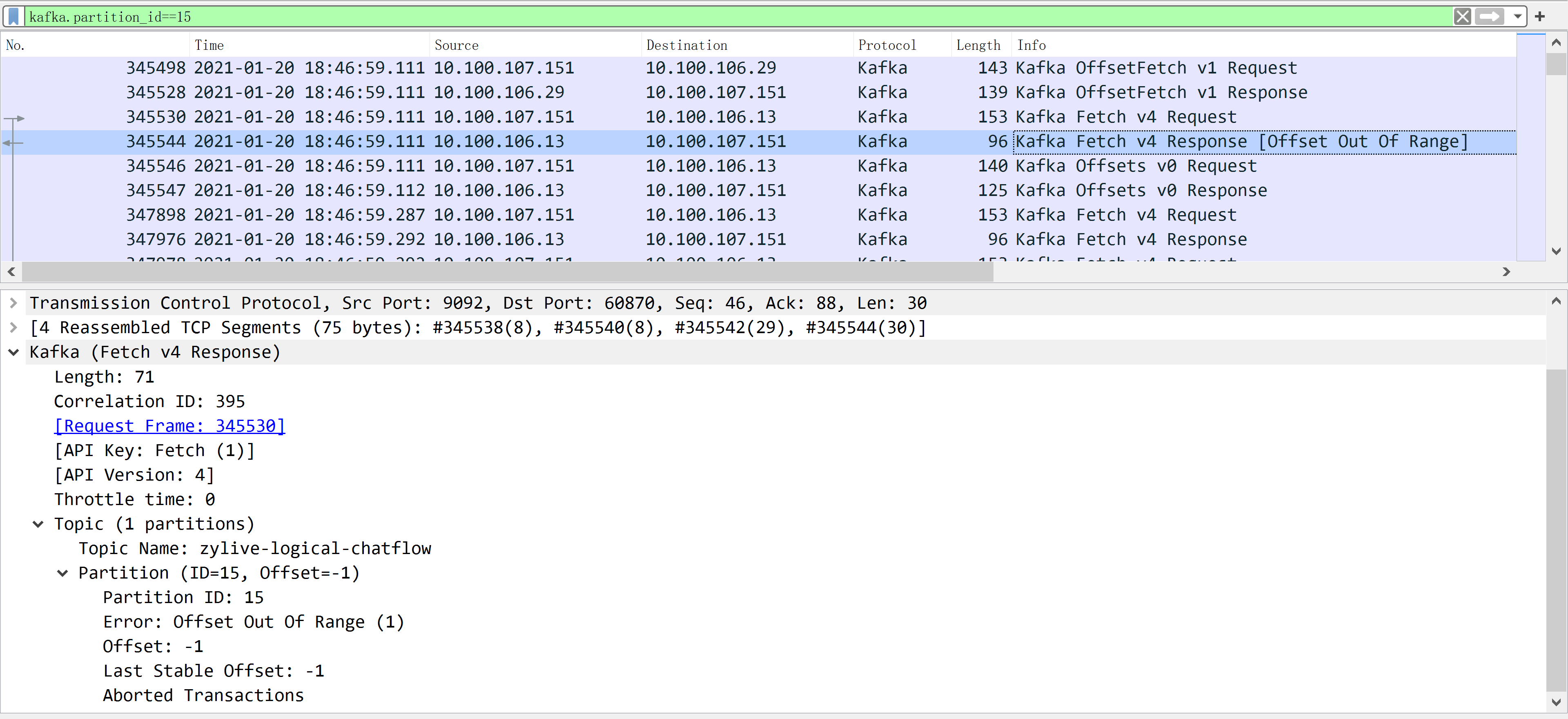 但是这个包太大了,载入 wireshark 后机器内存不足会打开失败,需要对原始文件进行拆分(命令:editcap -c <packets-per-file> <input-pcap-file> <output-prefix> ),具体参见这里。然后一次打开每个拆分后的文件,筛选的时候输入 kafka.partition_id==15 , 15 就是出问题的那个 partition 。拆分后的文件每个文件都按照这个筛选条件搜索,找到第一个出现问题的分片文件,如果这个命令的关键 TCP 包被截断,可以再和上一个分片做合并(命令格式: mergecap -w output.pcap input.pcap input2.pcap [input3.pcap . . .])。