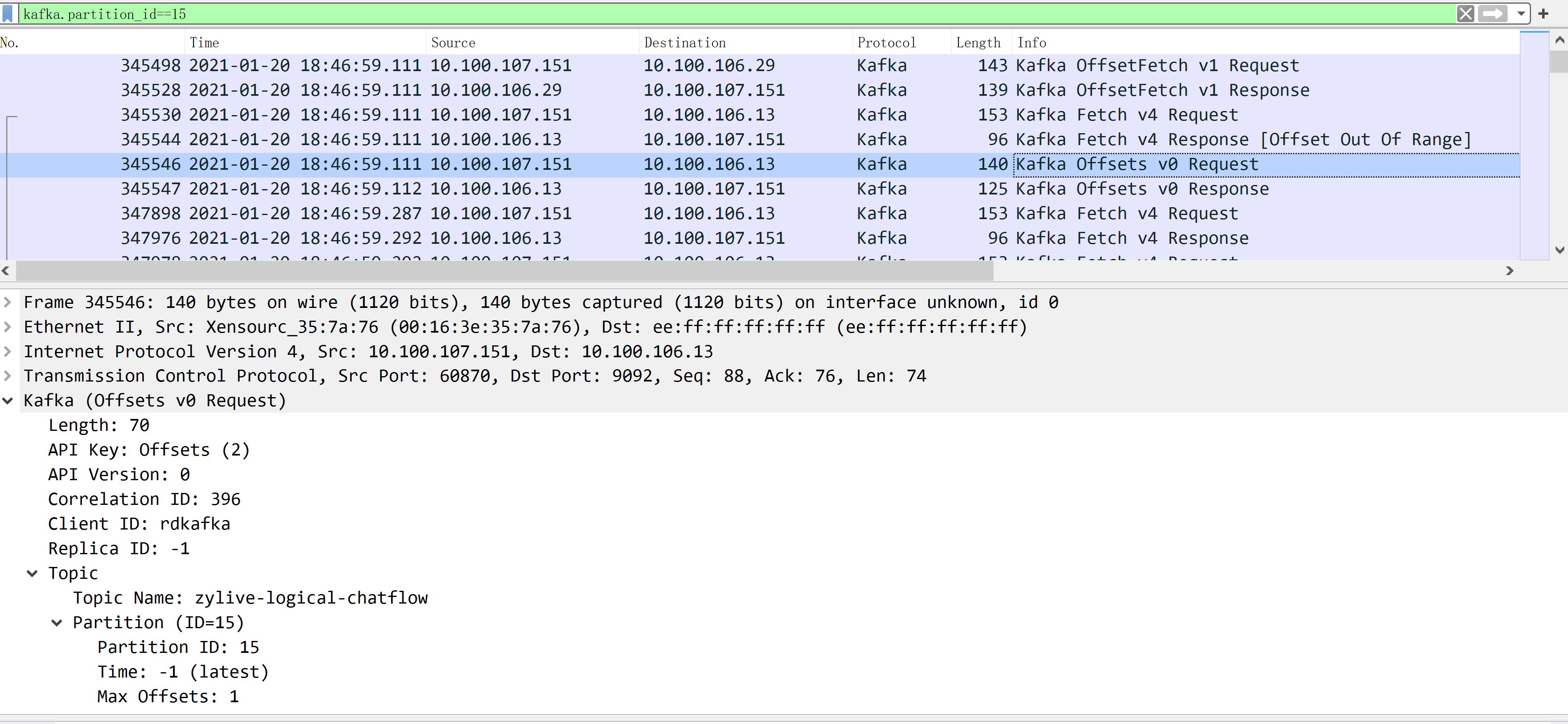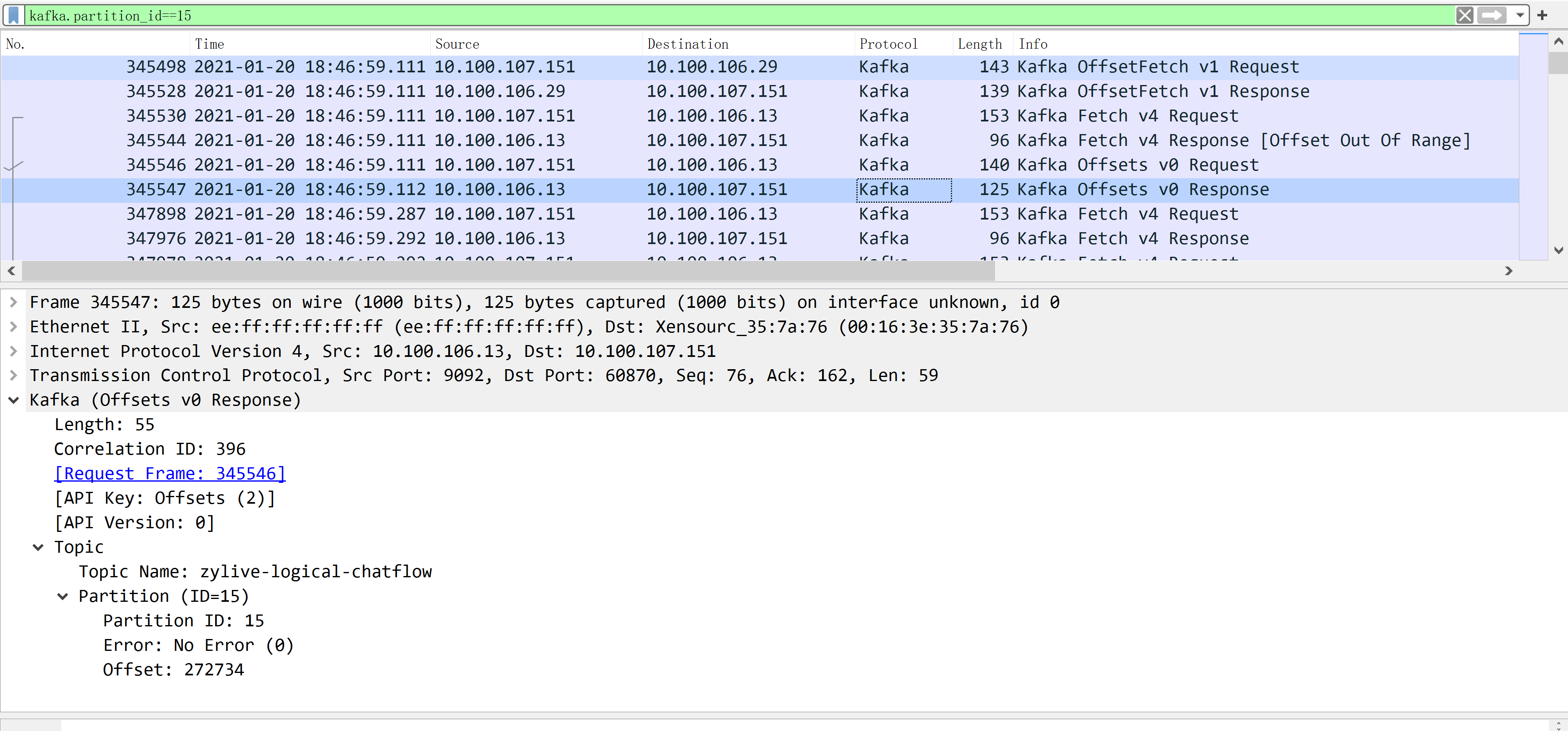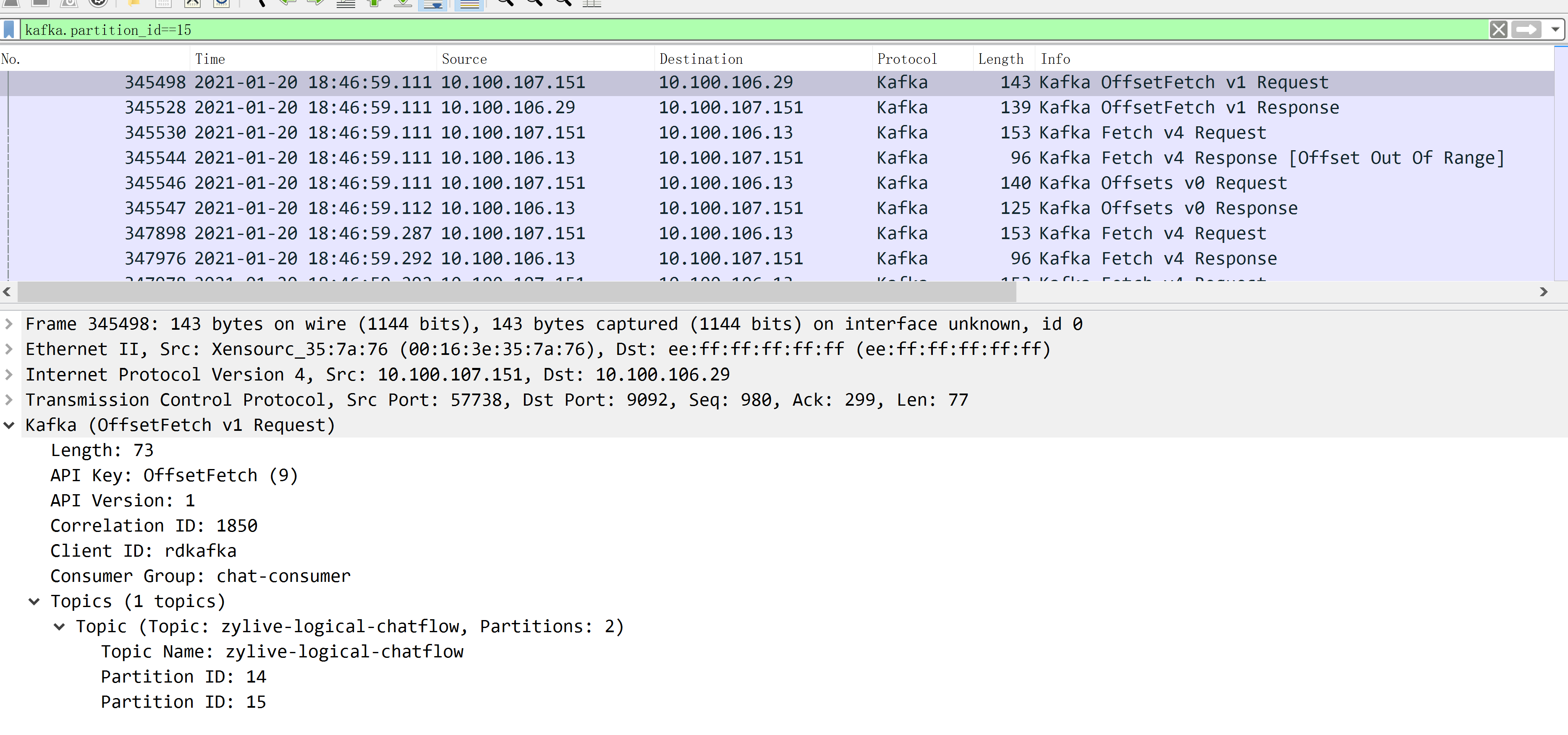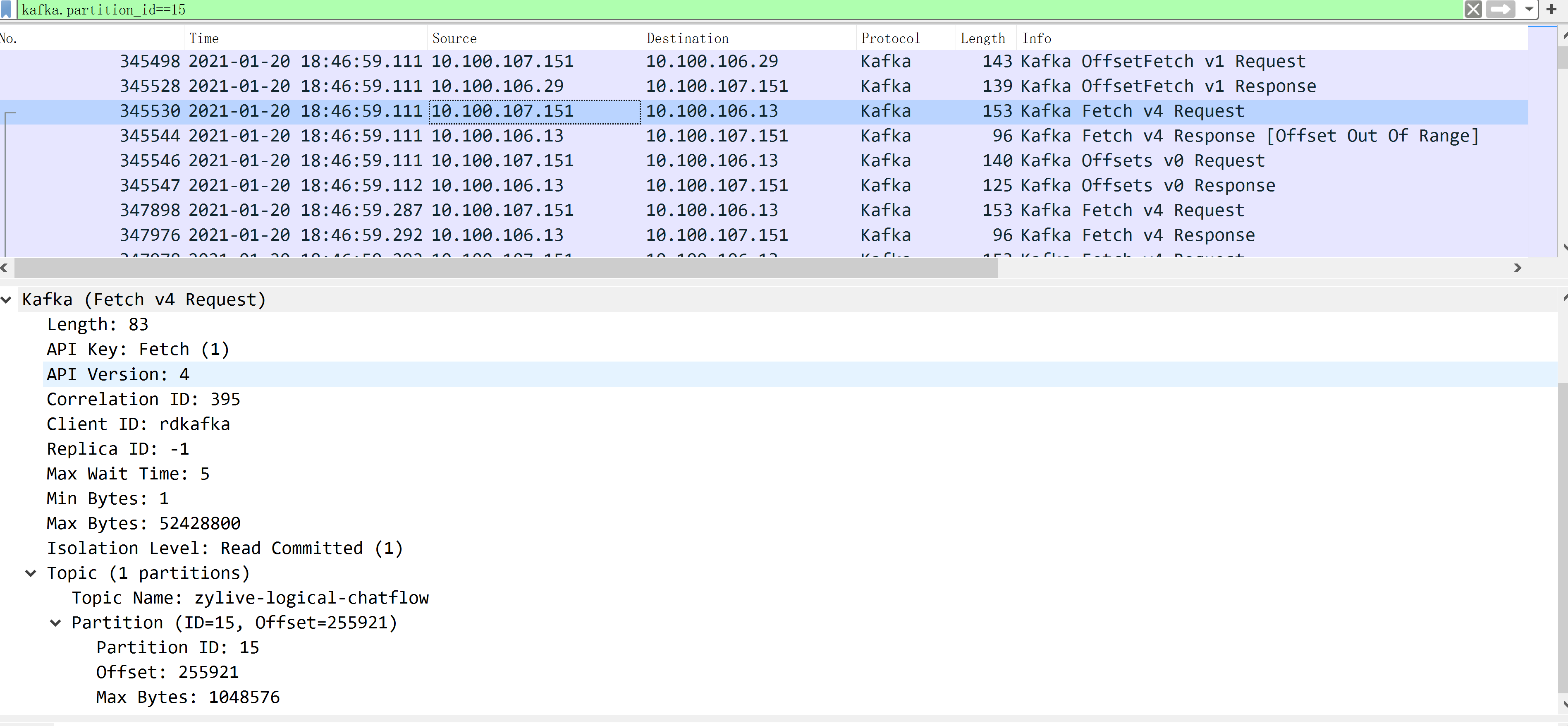 但是这个包太大了,载入 wireshark 后机器内存不足会打开失败,需要对原始文件进行拆分(命令:editcap -c <packets-per-file> <input-pcap-file> <output-prefix> ),具体参见这里。然后一次打开每个拆分后的文件,筛选的时候输入 kafka.partition_id==15 , 15 就是出问题的那个 partition 。拆分后的文件每个文件都按照这个筛选条件搜索,找到第一个出现问题的分片文件,如果这个命令的关键 TCP 包被截断,可以再和上一个分片做合并(命令格式: mergecap -w output.pcap input.pcap input2.pcap [input3.pcap . . .])。