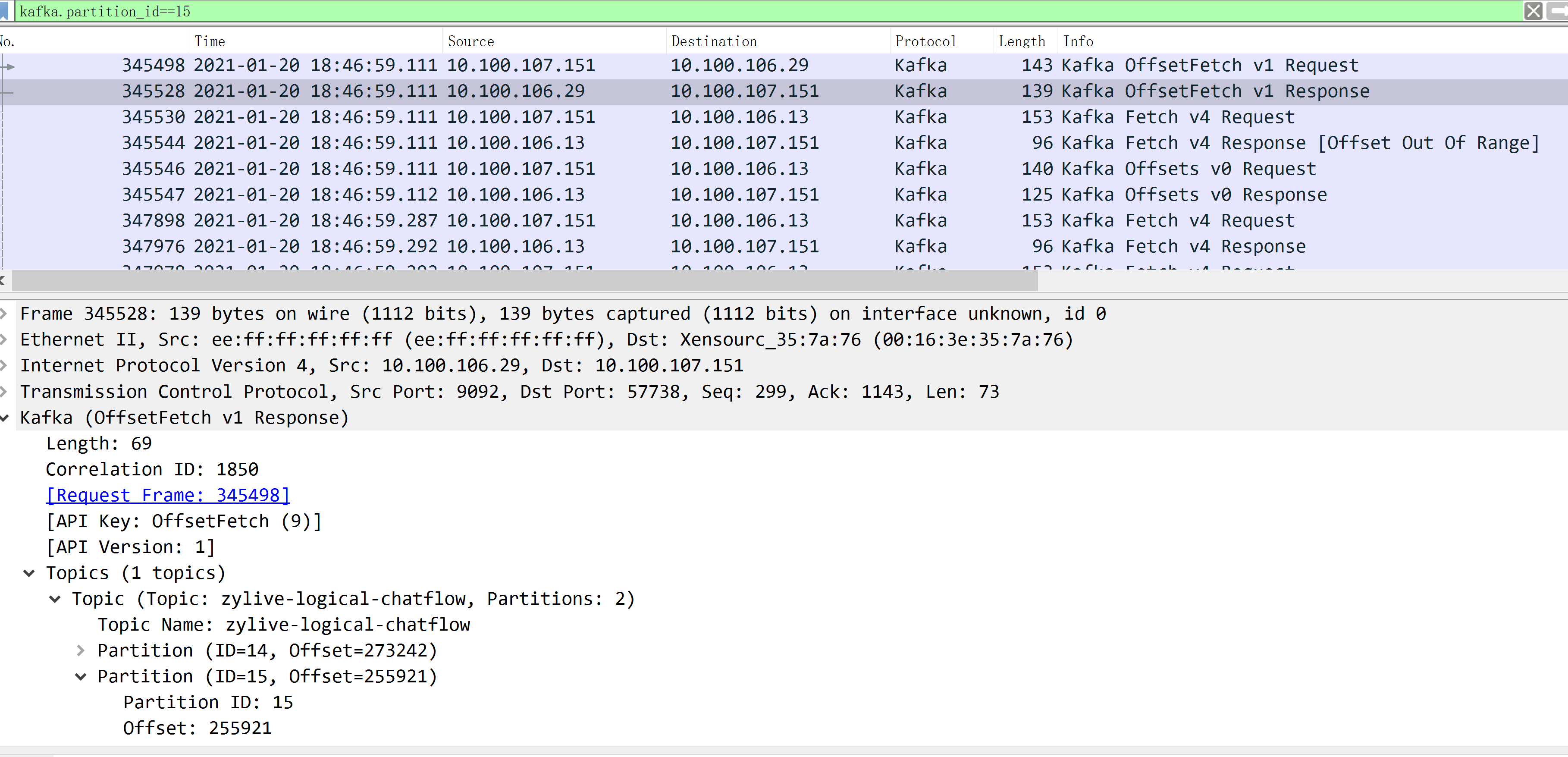 首先看第一个 OffsetFetch 请求,请求 partition 15 的当前消费进度。