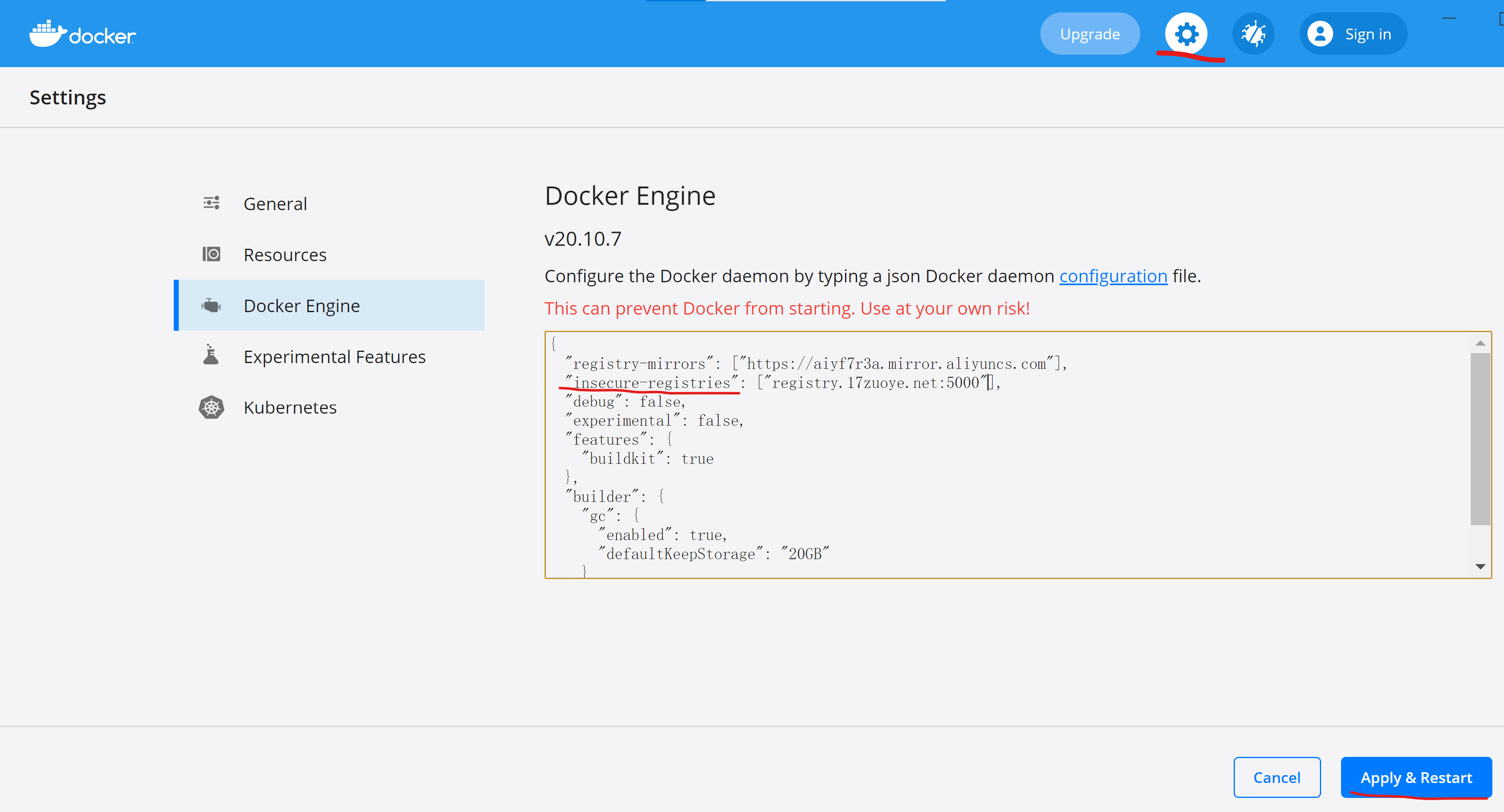 在 insecure-registries 数组中添加公司的镜像仓库根地址。